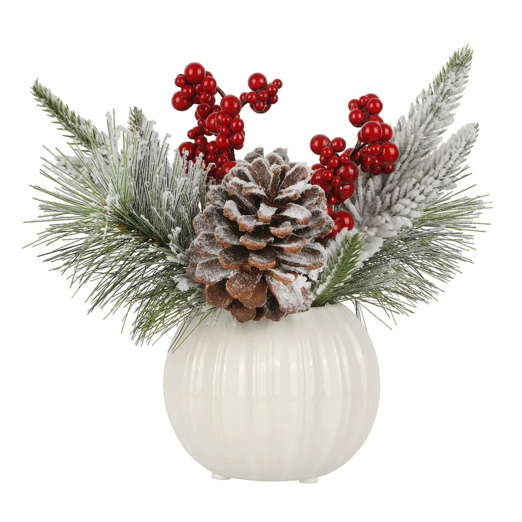 This tabletop mixed pine needle and berry arrangement is perfect for adding to your winter dรฉcor. Place it on your table or counter for the perfect look!