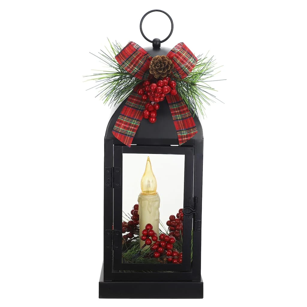 This festive lantern features battery-operated LED candle surrounded by holly berries. Accented with additional holly berries, pine branches and a bow, this tabletop décor will be a great addition to your Christmas décor.