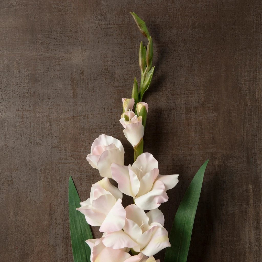 This perfect replica of white Gladiolus with a hint of rose blush will make a lovely addition to your floral arrangements. The stem has leaves and flower buds to add to its realistic look. Use this stem to create pretty floral arrangements like bouquets, table toppers, wreaths and more.