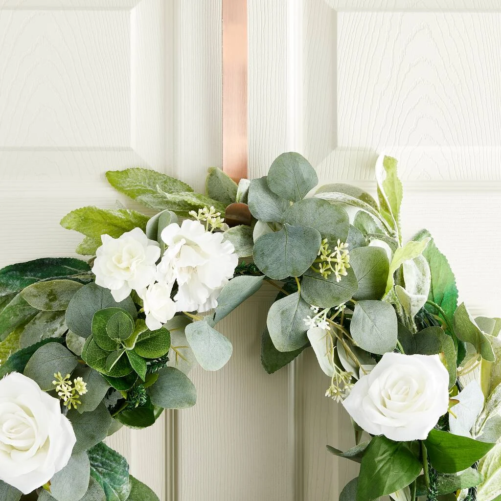 Create the perfect mood for every holiday or for every room with beautiful hanging displays. This wreath hanger is perfect to display wreaths, swags, bows, pew markers and more quickly and easily. The metal hanger is designed to fit perfectly over interior or exterior doors. It works well on wood, metal and glass doors, and it eliminates the need for screws and nails.
