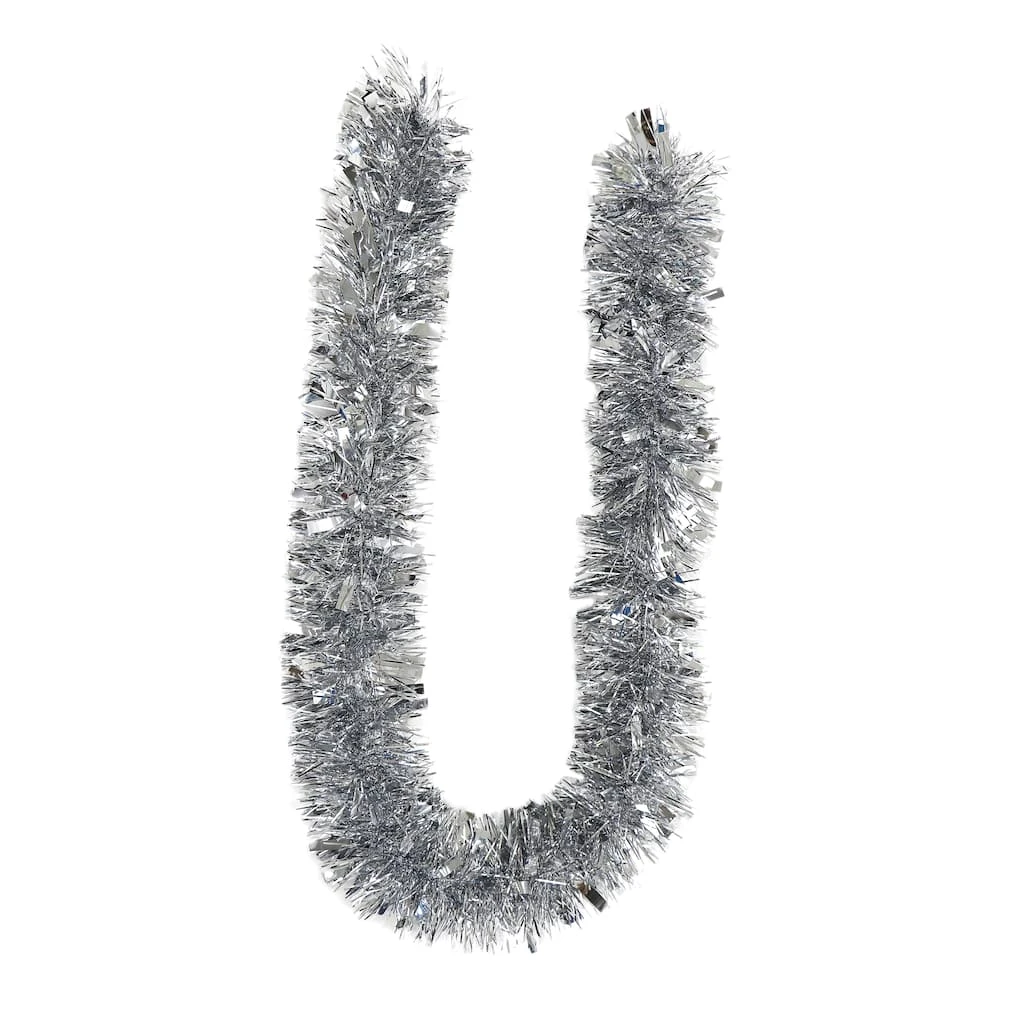 Bring a touch of Christmas magic to your décor with this extra-wide garland of shimmery silver tinsel. This flashy garland will make a great addition to your tree, or drape across a mantel or banister paired with lights and greenery for a fun, festive display full of holiday cheer.