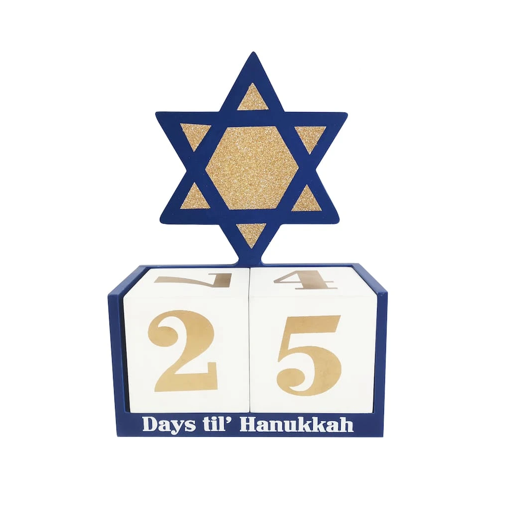 This tabletop countdown with a Star of David embellishing the top is a wonderful way to eagerly await Hanukkah with your family. Featuring a base with the words “Days til’ Hanukkah” holding white and gold number blocks, this piece is sure to bring cheer to your home as you celebrate the festival of lights.