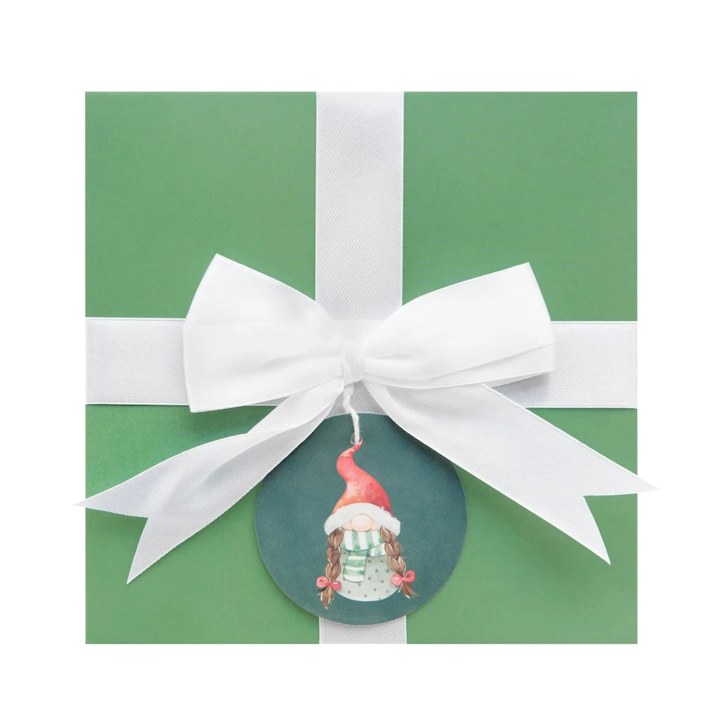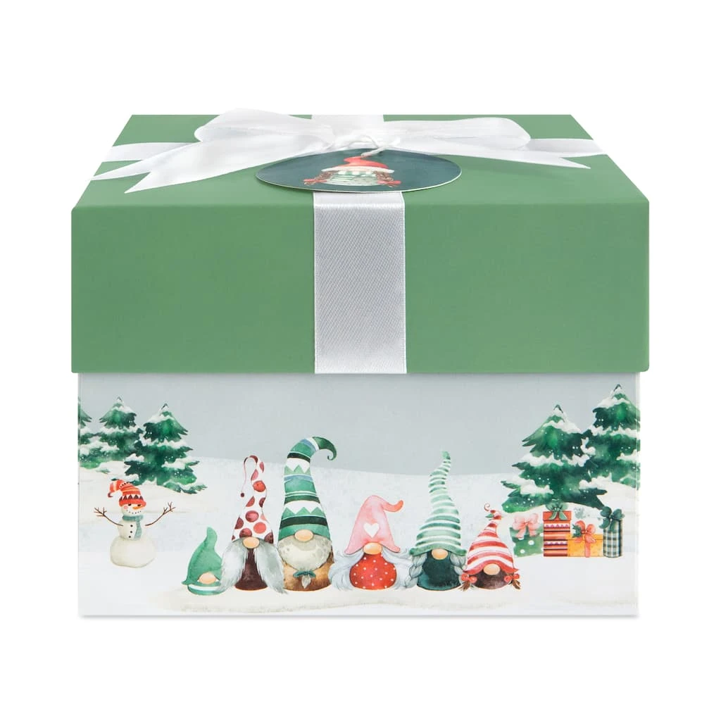 Featuring an adorable design of gnomes in oversized pointy hats celebrating the holidays, this charming box is a fantastic way to dress up your holiday presents with festive flair. With a pretty satin bow and coordinating tag, use for decorating under the tree or to hold a special gift sure to stand out as you celebrate the Christmas season with your loved ones.