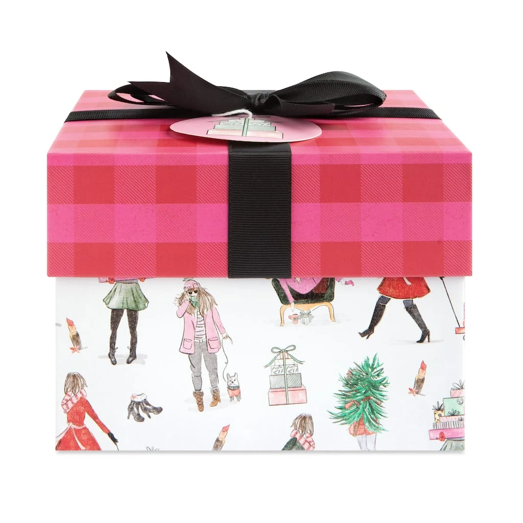 Featuring a fun design of fashionistas enjoying the holidays, this charming box is a fantastic way to dress up your holiday presents with festive flair. With a pretty satin bow and coordinating tag, use for decorating under the tree or to hold a special gift sure to stand out as you celebrate the Christmas season with your loved ones.