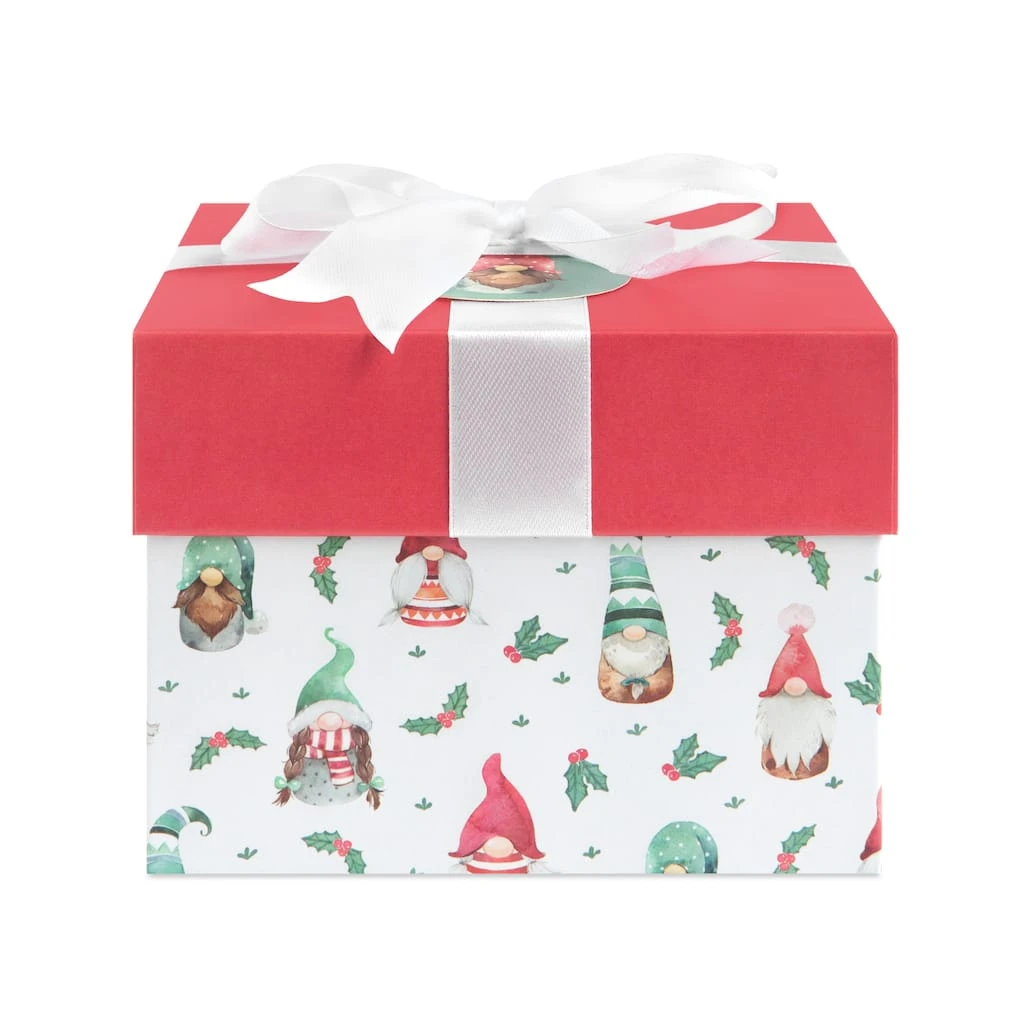 Elevate your gift presentation with this decorative gift box. It features an adorable gnome design and is accented with a bow on top.